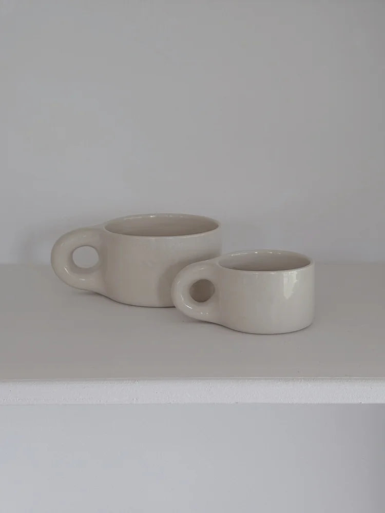 Handmade in Byron Bay by Jedda, the Chubby Mug is designed for comfort and everyday ritual. Available in two sizes, each piece is crafted from white stoneware clay and finished in your choice of Cream or Red Ash glaze.