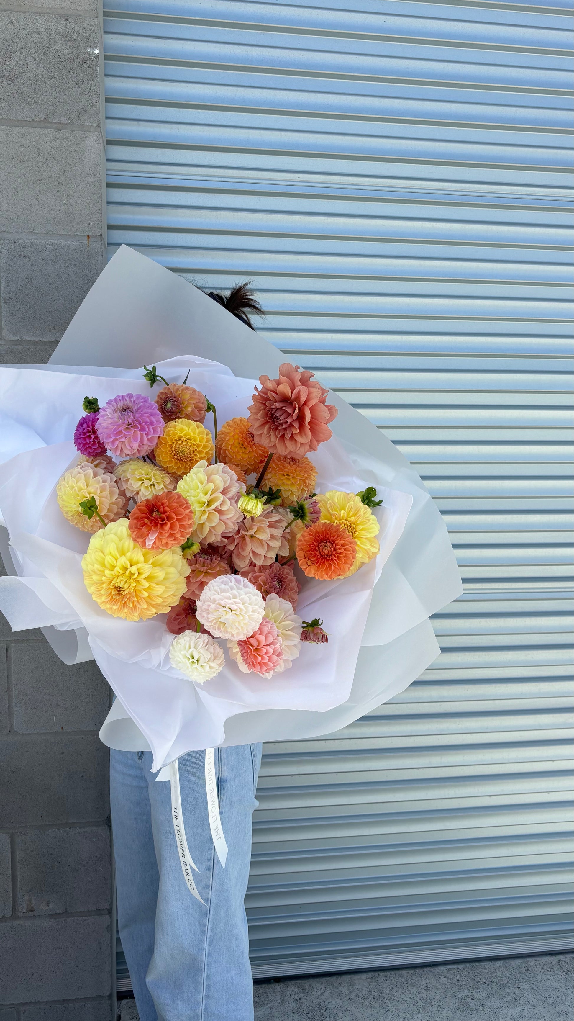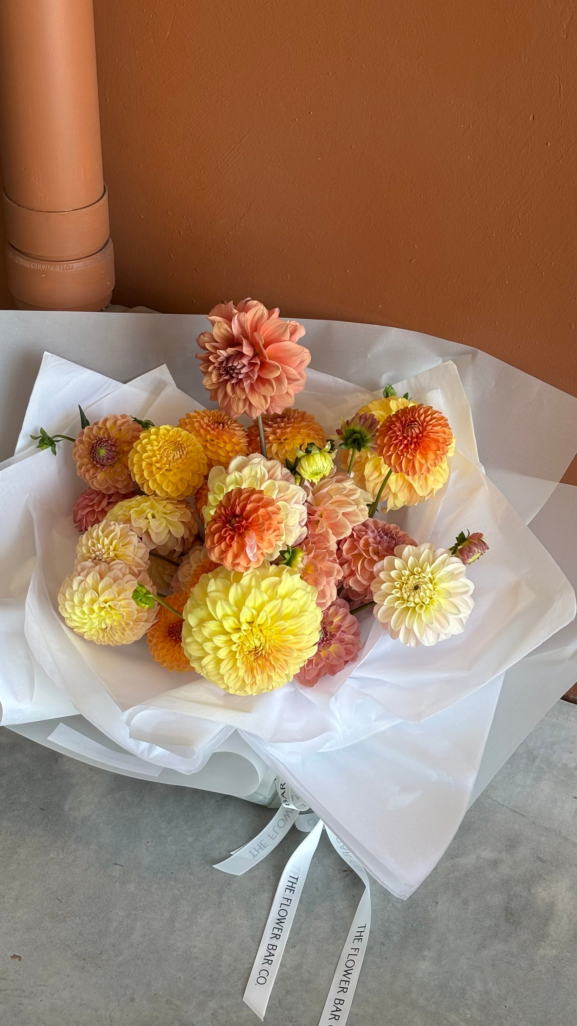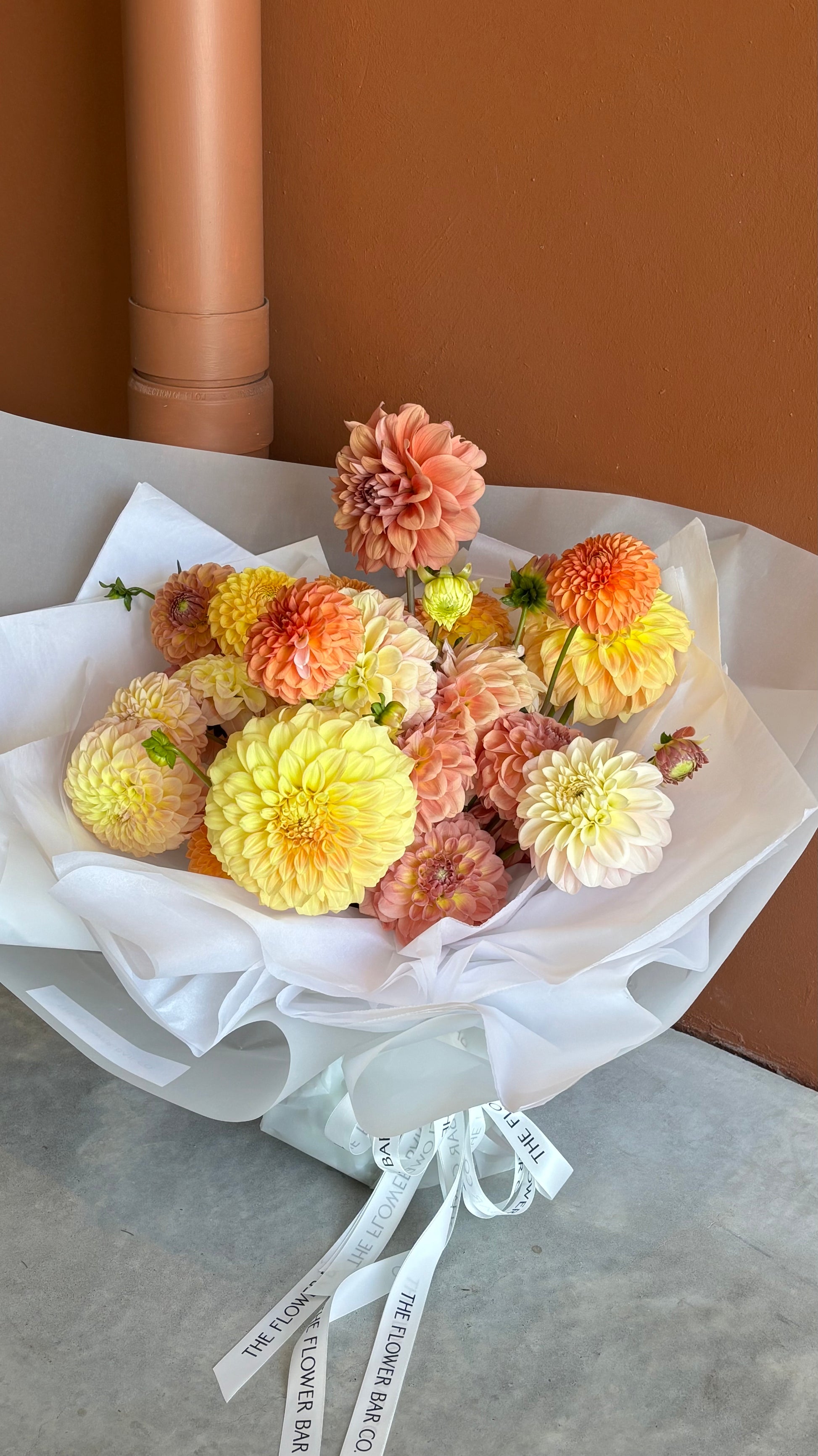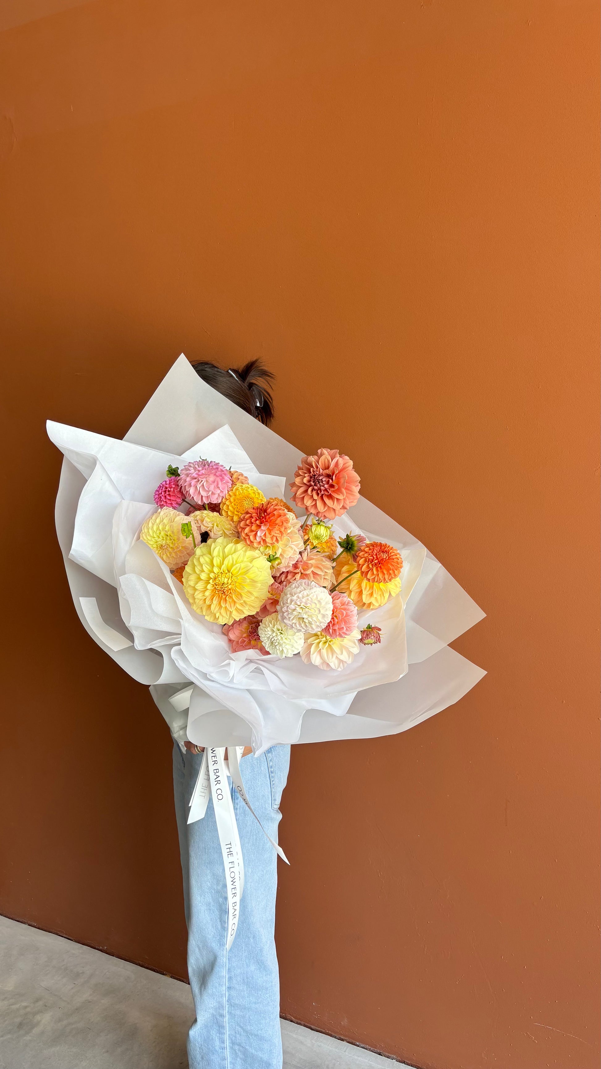 Designed en masse, this arrangement features a generous gathering of premium seasonal blooms in a harmonious mix of colour-rich tones. Lush and textural, it captures the feeling of flowers at their peak — overflowing, effortless and beautifully alive.