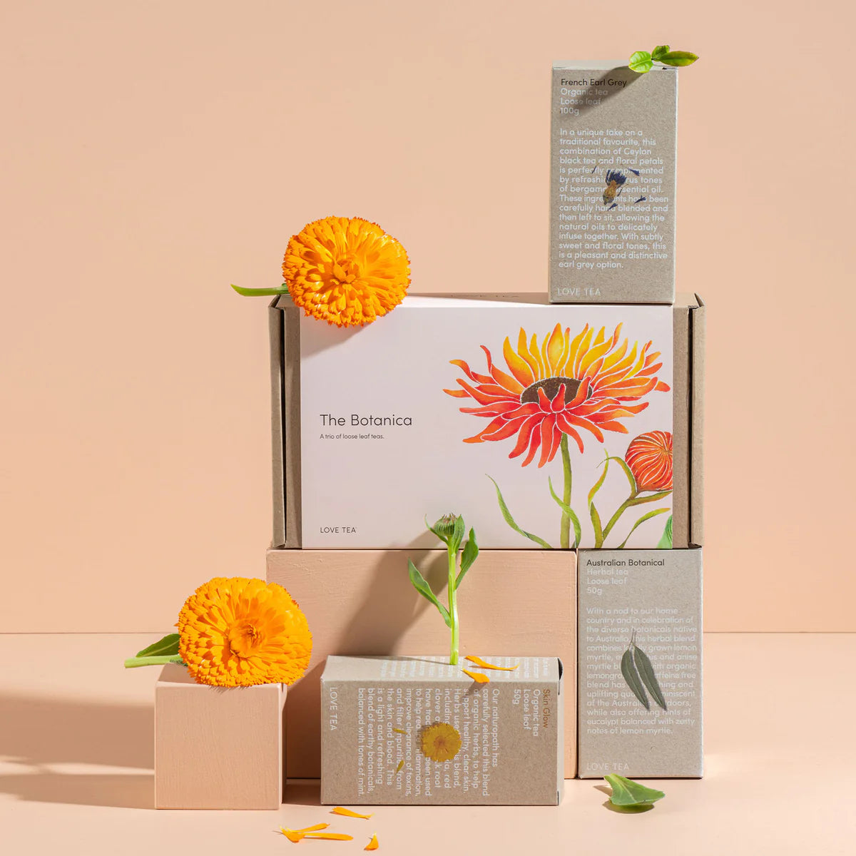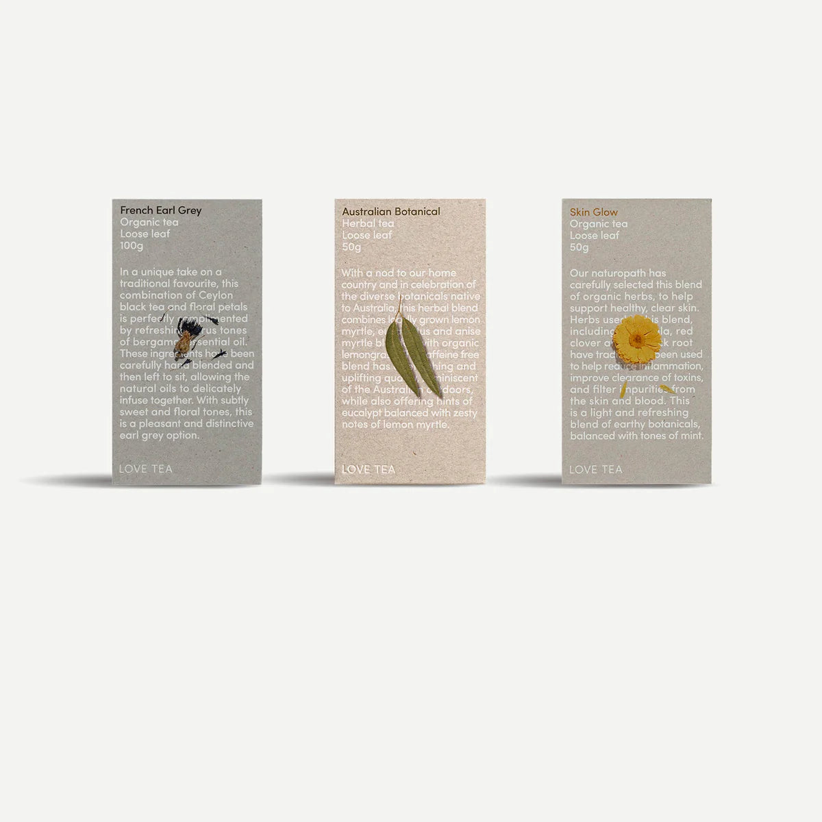 A trio of teas designed to carry you through your day. This selection of loose leaf tea includes French Earl Grey, Australian Botanical and Skin Glow, three of Love Tea's most loved blends, which have been handcrafted with a great deal of care, right here in Australia.